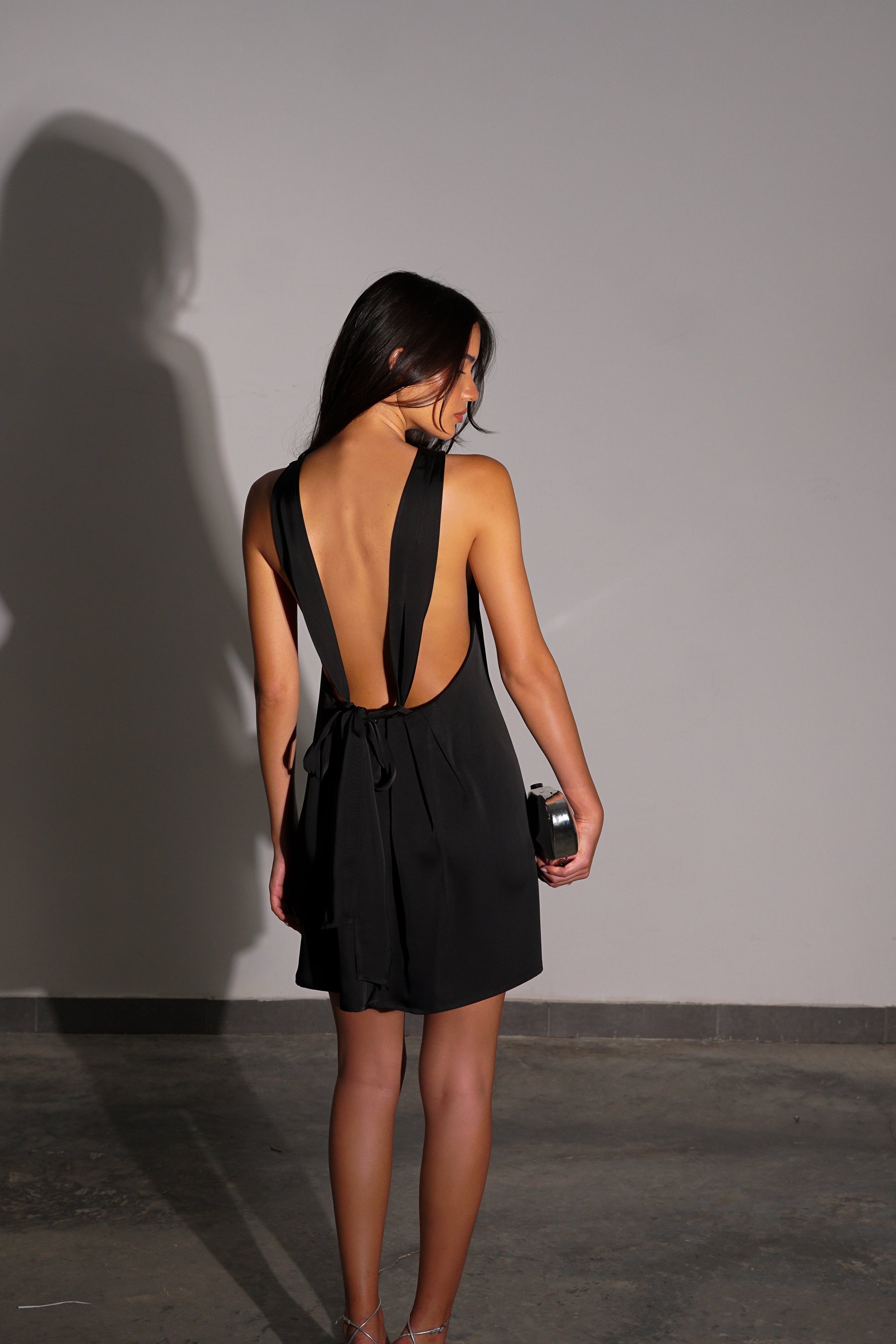 שמלת סאטן נשפכת בגזרת מיני עם פתח וקשירה אחורית